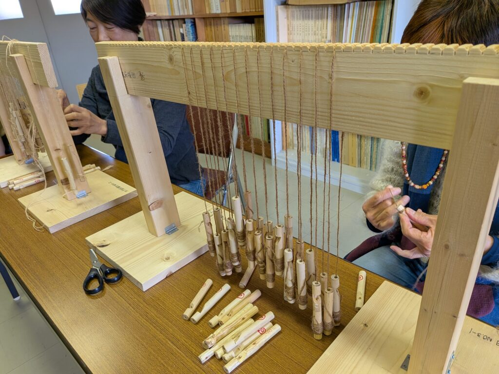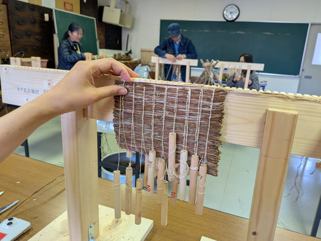 応援団では、3月29日(日)に昨年刈り取ったカラムシを使って縄文時代から行われていたあんぎん編み体験ワークショップを行いました。